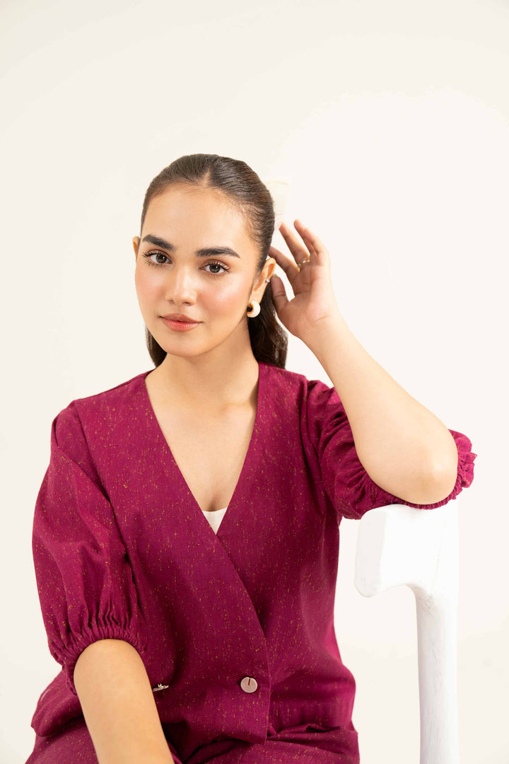 Overlapped V Neckline With Buttons Detail On Front, Puffy Gathered Sleeves, Basic Top