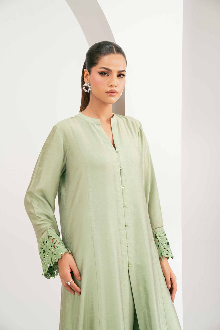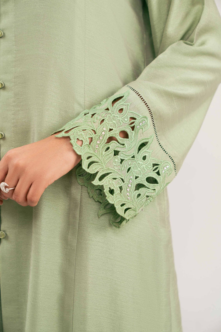 Paneled front-open shirt featuring cutwork detailing on the sleeves.
