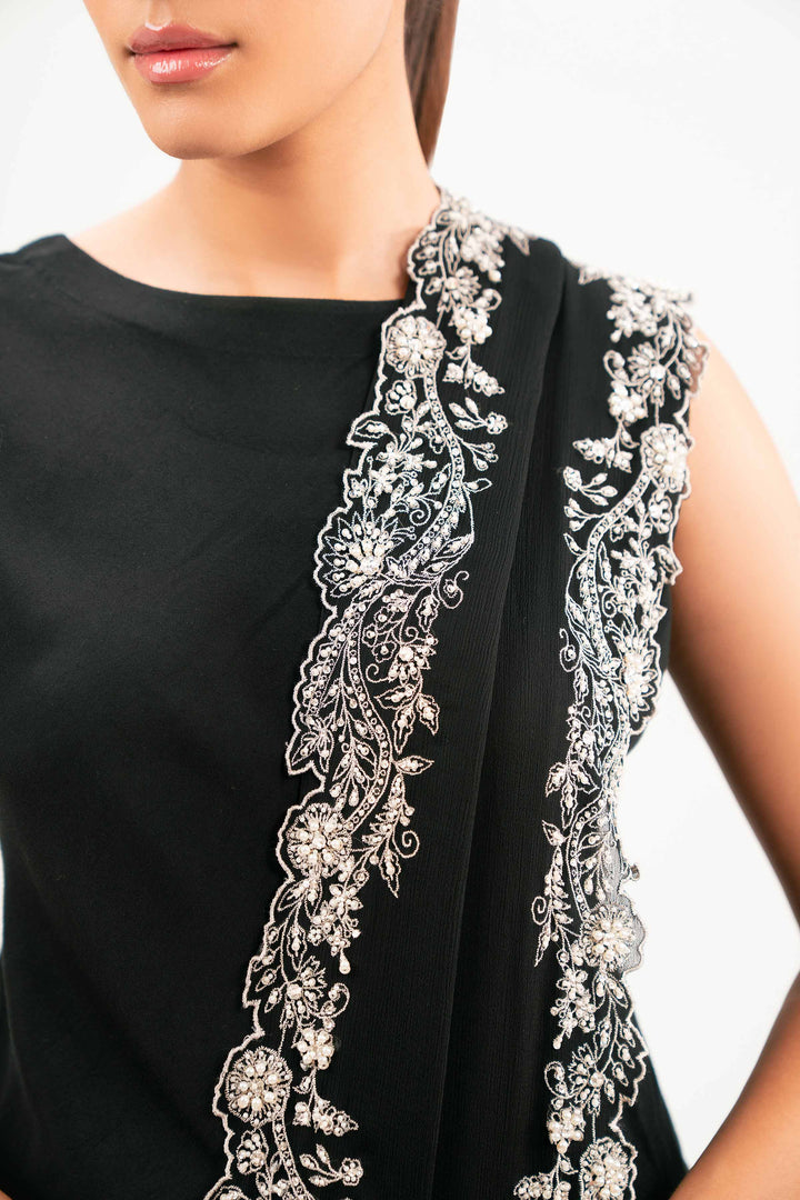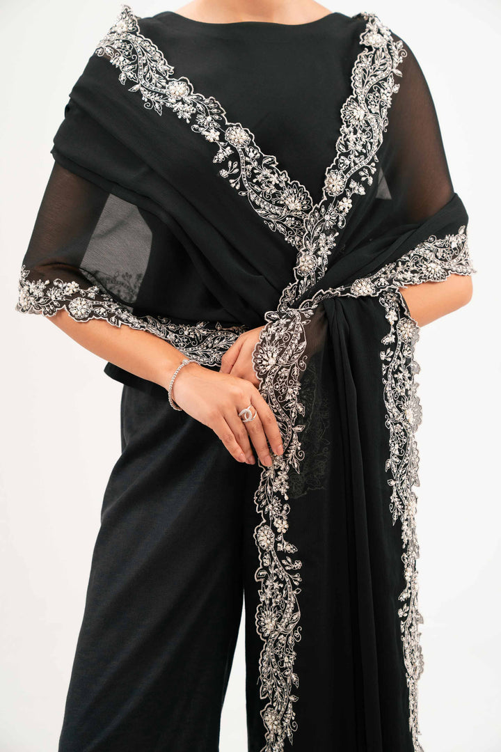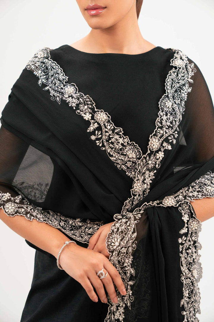 Stand-alone black chiffon dupatta enhanced with embroidery and adda work.