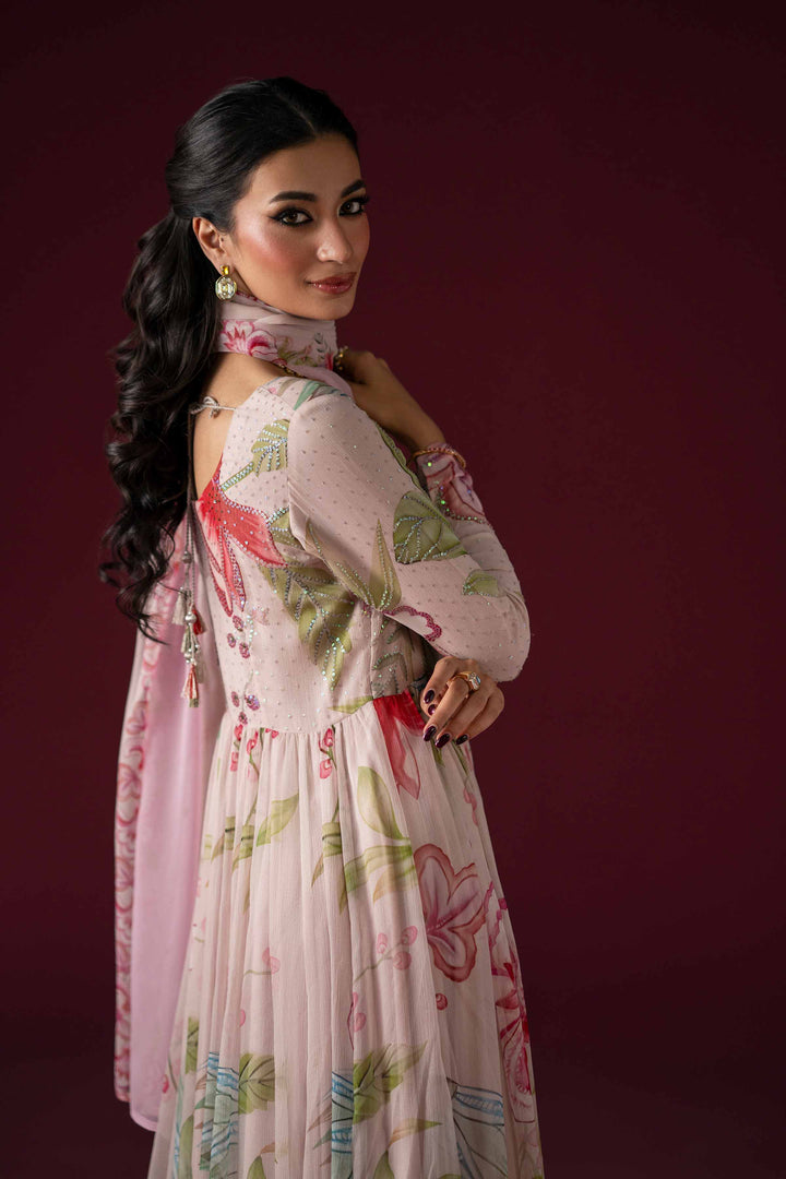Long printed chiffon dress featuring a sweetheart neckline, enhanced with embellishments on the yoke.