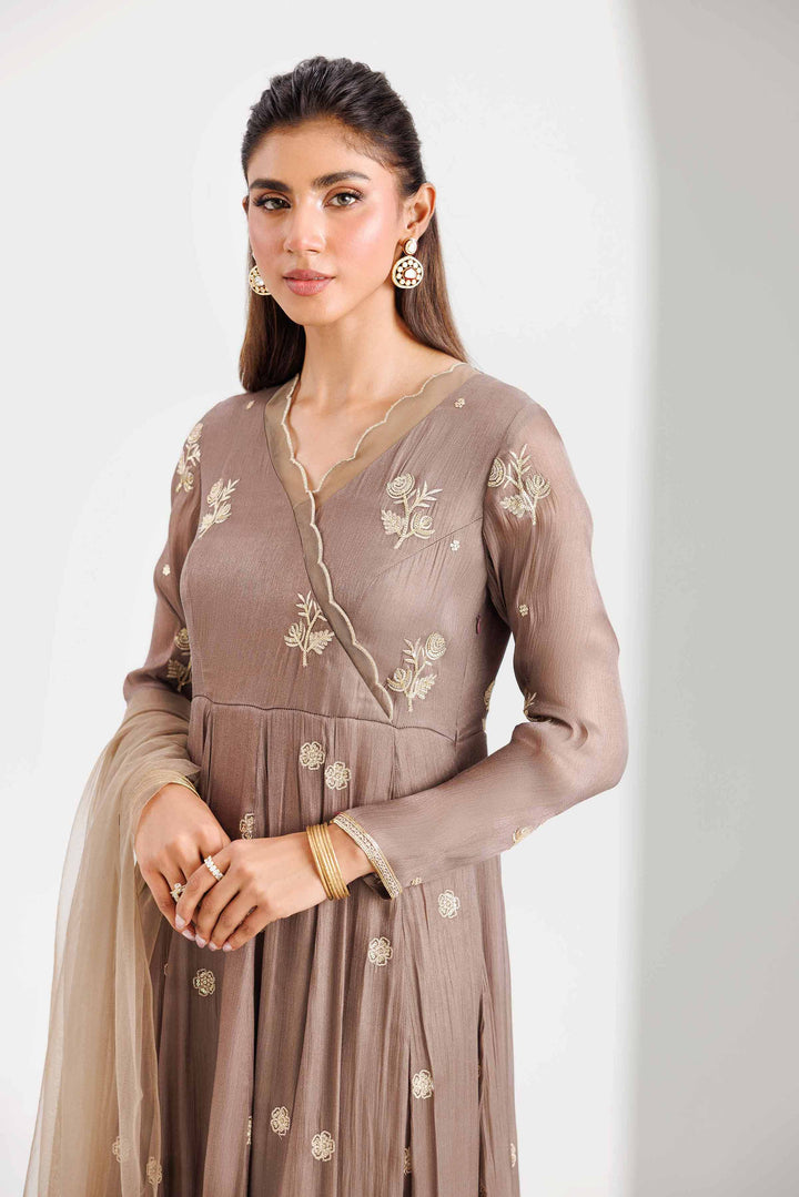 Long embroidered sequined angrakha-style paneled dress featuring net scallops at the neckline, enhanced with an embroidered border at the hem.