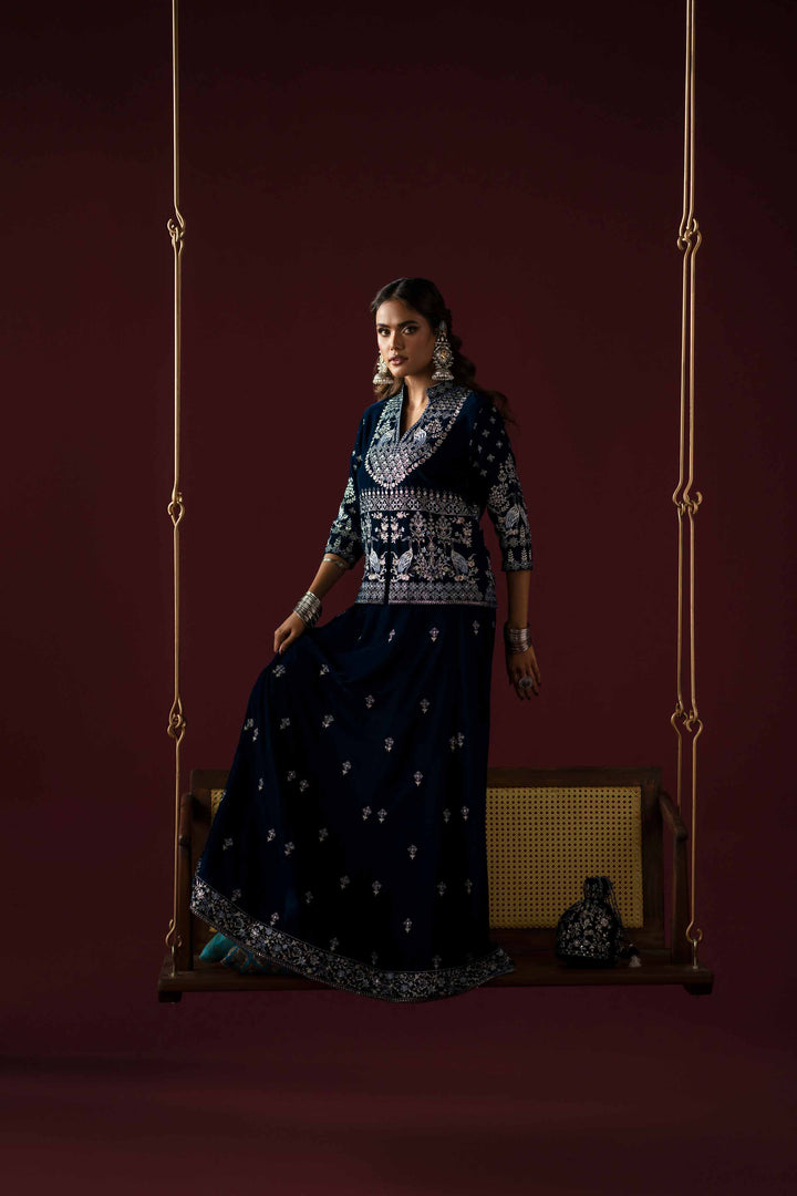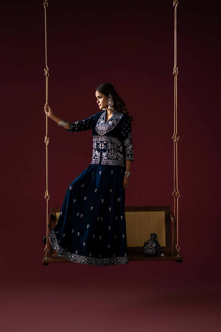 Short jacket featuring a band V-neckline with machine embroidery on the front, back, and sleeves. The design is enhanced with silver badla and tilla work, incorporating 3–4 shades for a rich, gradient effect.