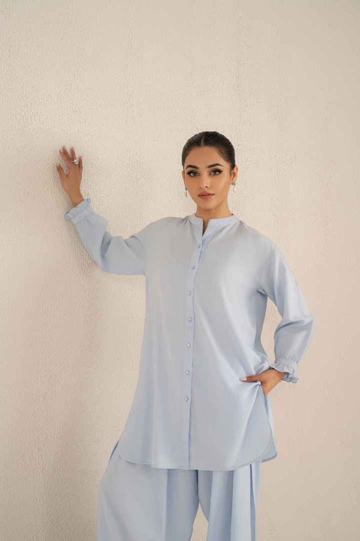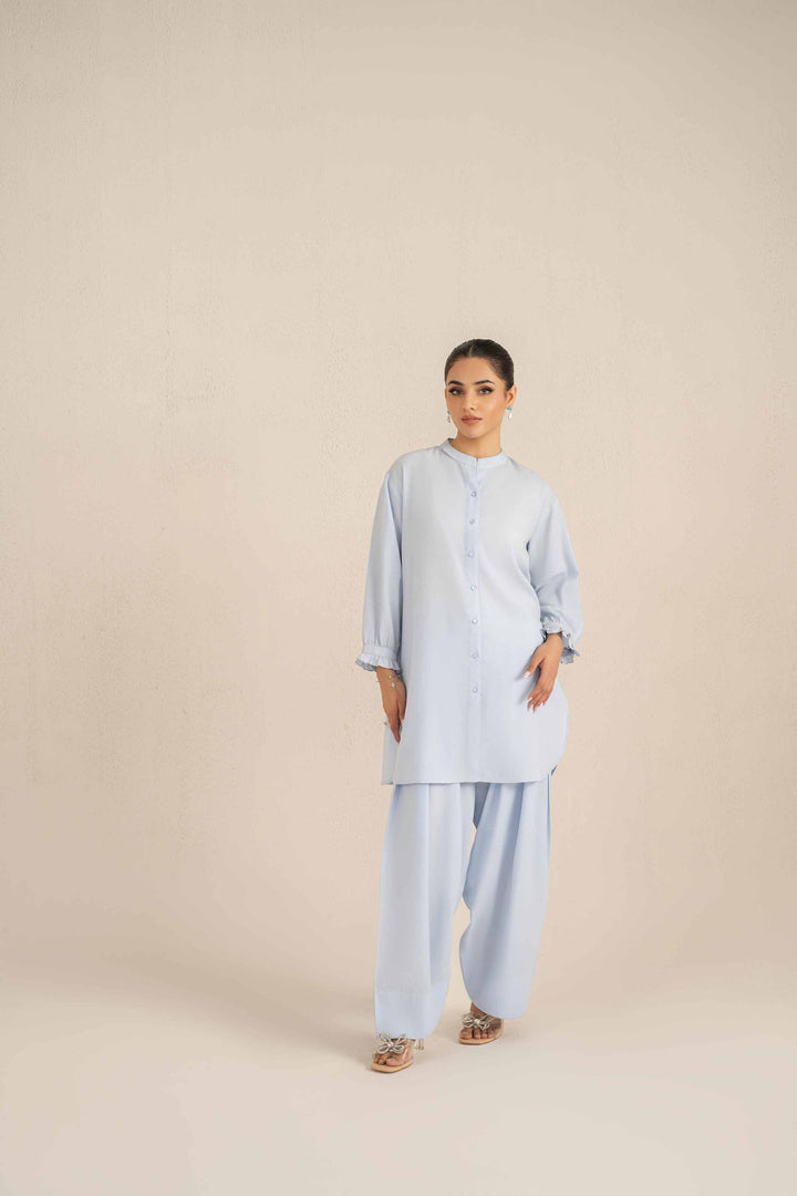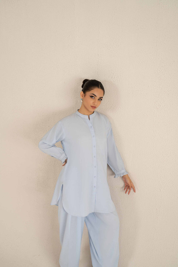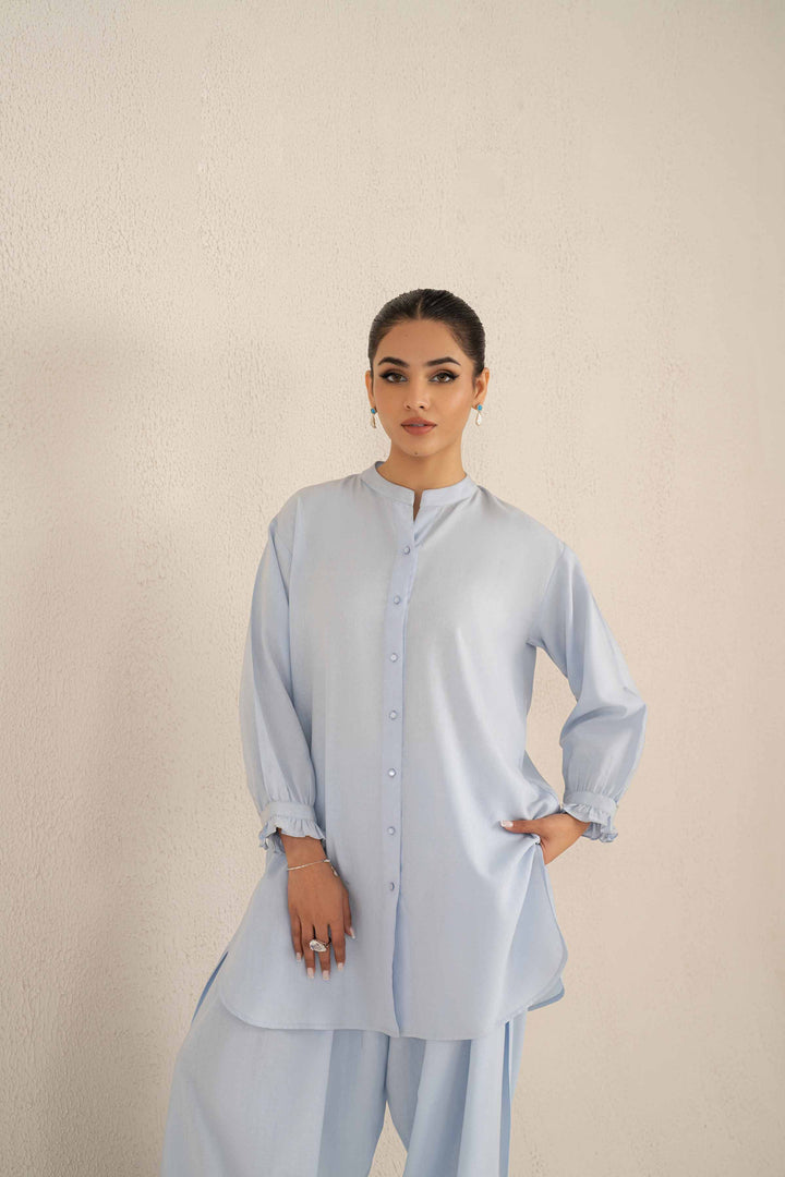 Band Neckline With Buttons Detail On Placket, Cuffed Sleeves With Frill, Round Hem, Short Button Down Shirt