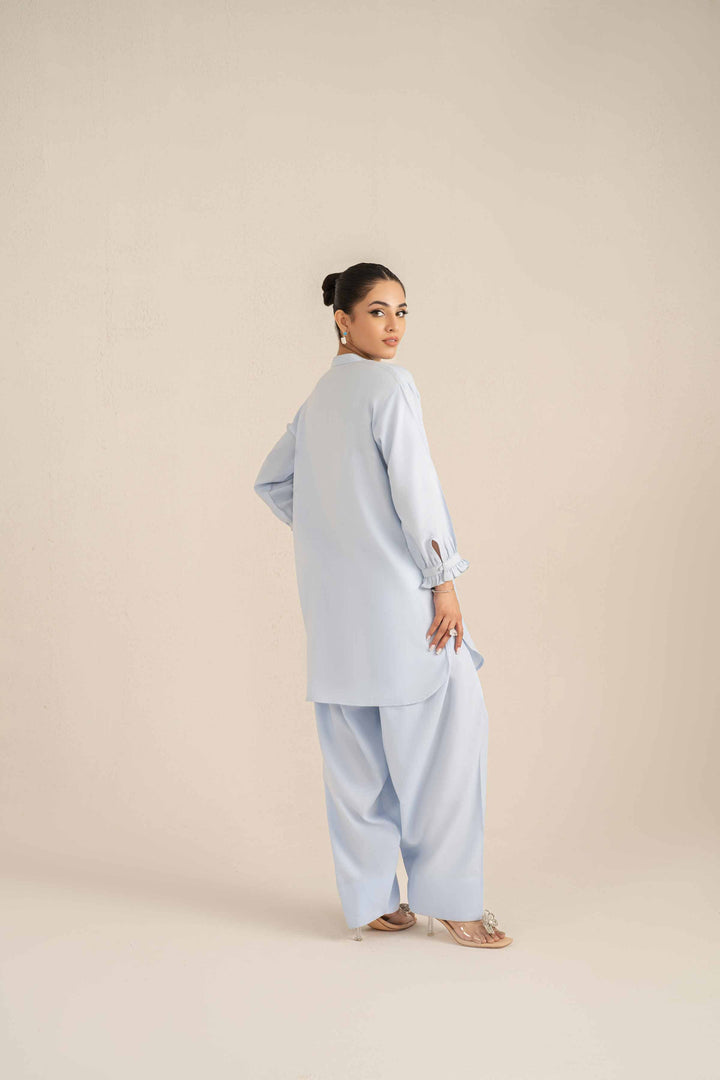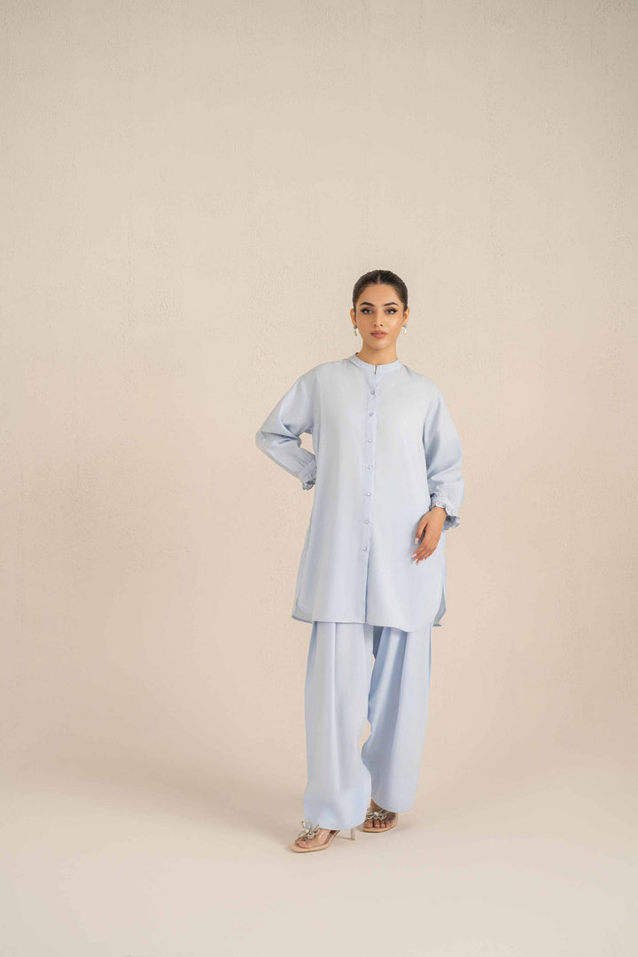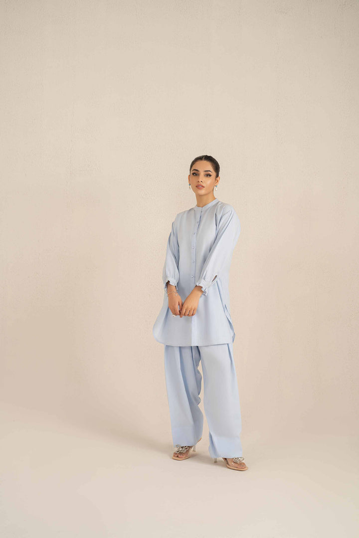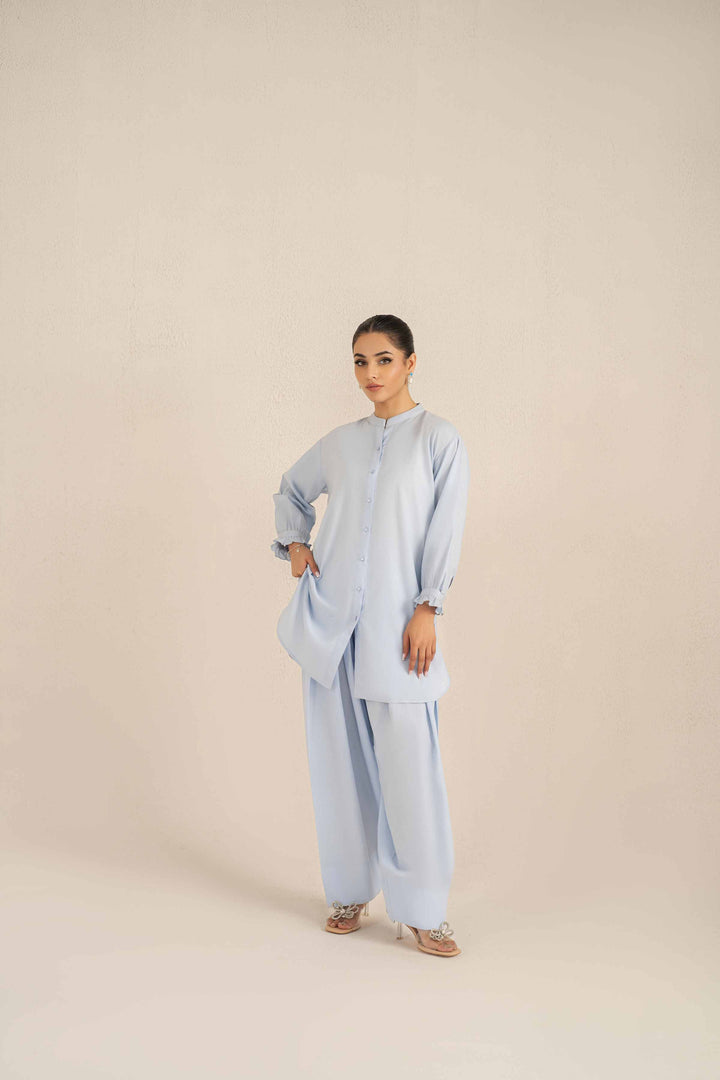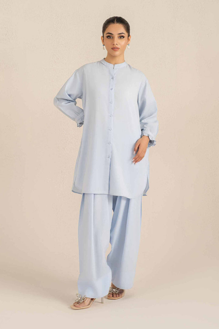Band Neckline With Buttons Detail On Placket, Cuffed Sleeves With Frill, Round Hem, Short Button Down Shirt