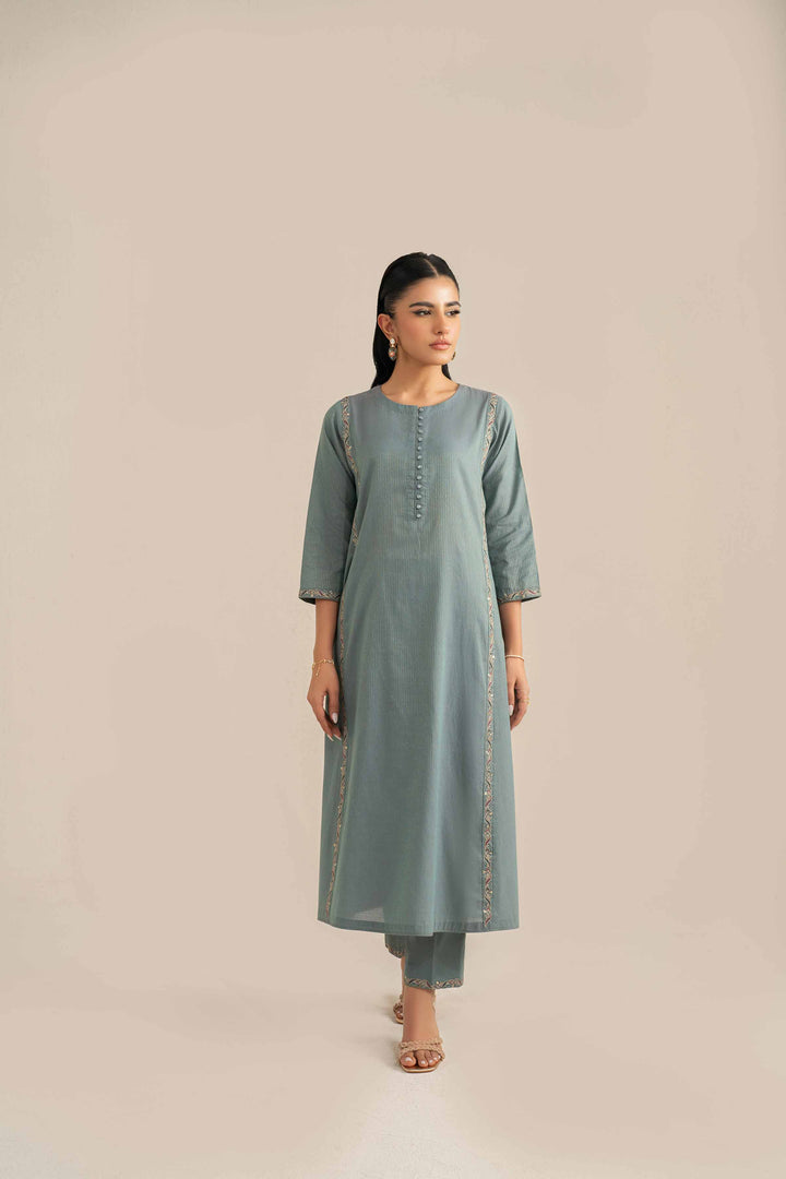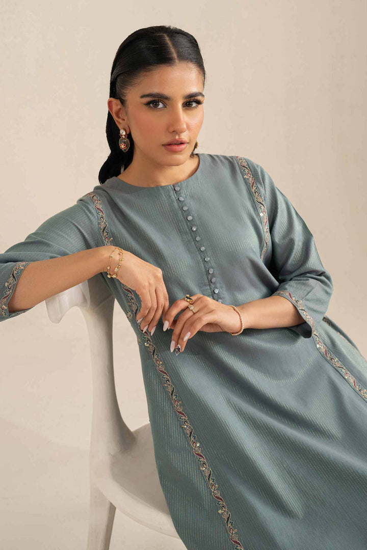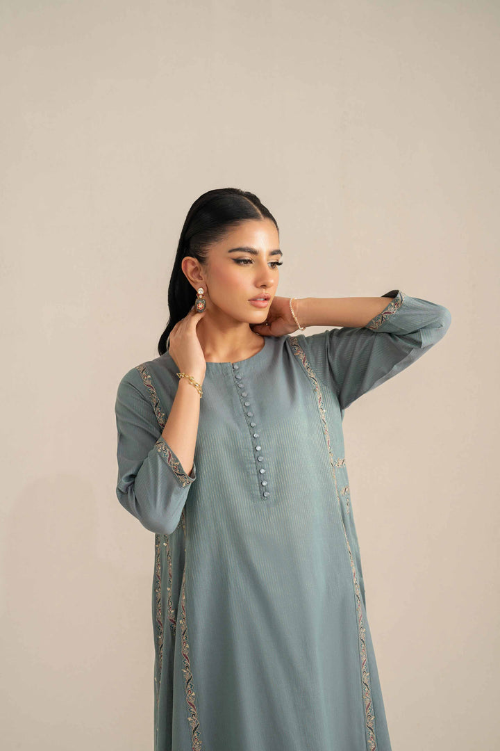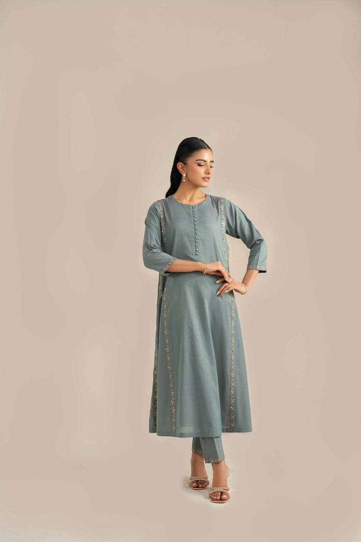 Add a touch of cool affection to your look by wearing this embroidered two-piece suit from the latest luxury pret summer collection.