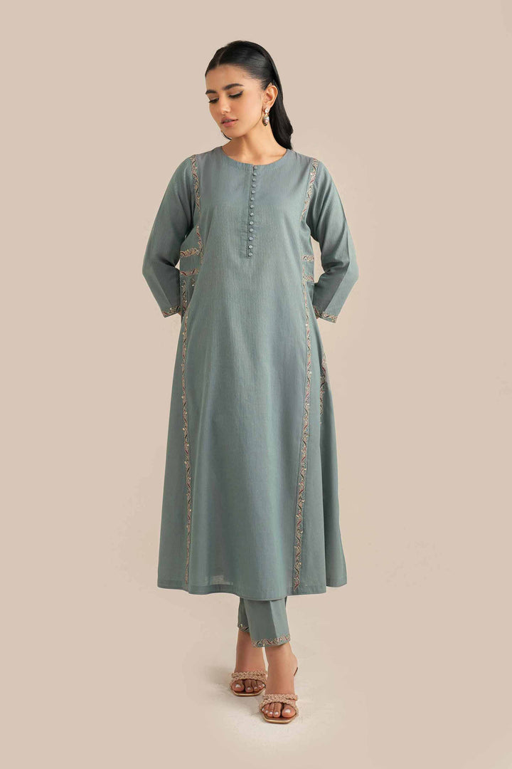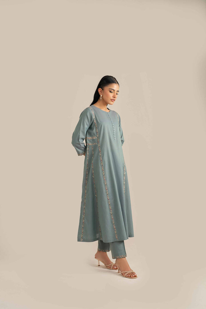 Round Neckline With Buttons & Loops On Piping, Long Embroidered Paneled Dress