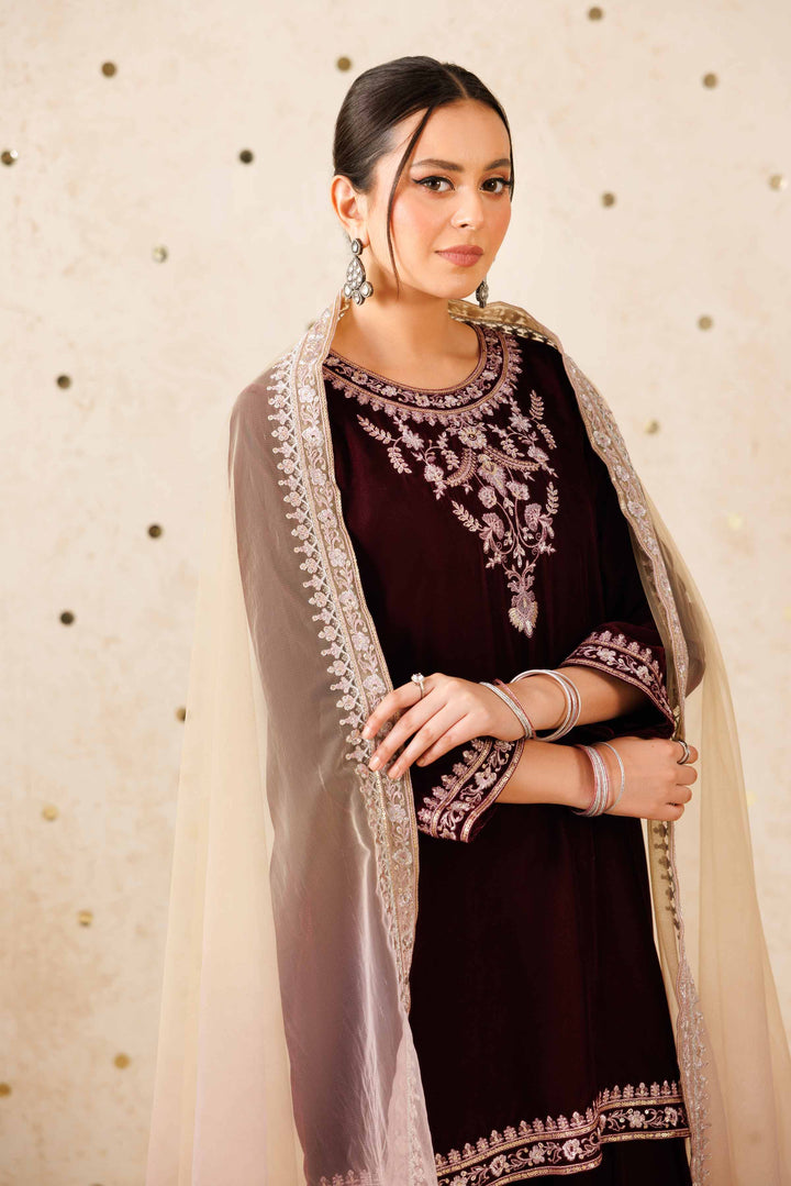 Stand out this Winter with this embroidered three-piece suit from the latest Luxury Pret Winter Collection, designed with intricate craftsmanship and grace.