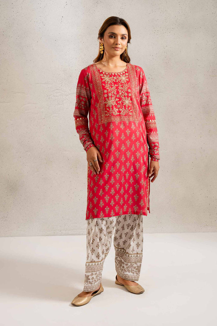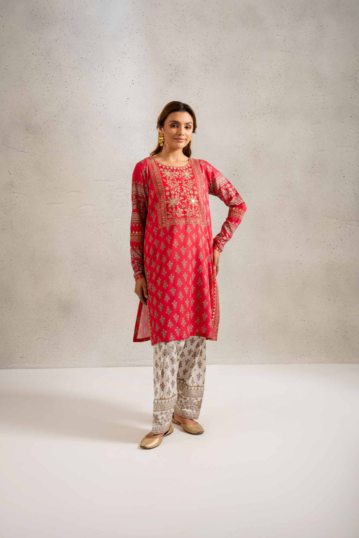 Round Neckline, Full Sleeves, Embroidered Short Shirt