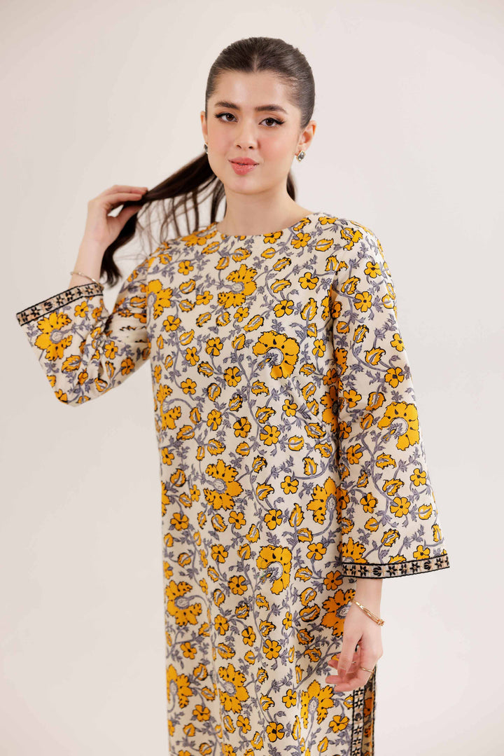 Round Neckline, Embroidered Sleeves Edges And Side Slits, Of Hem Printed Long Shirt