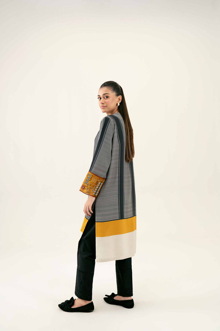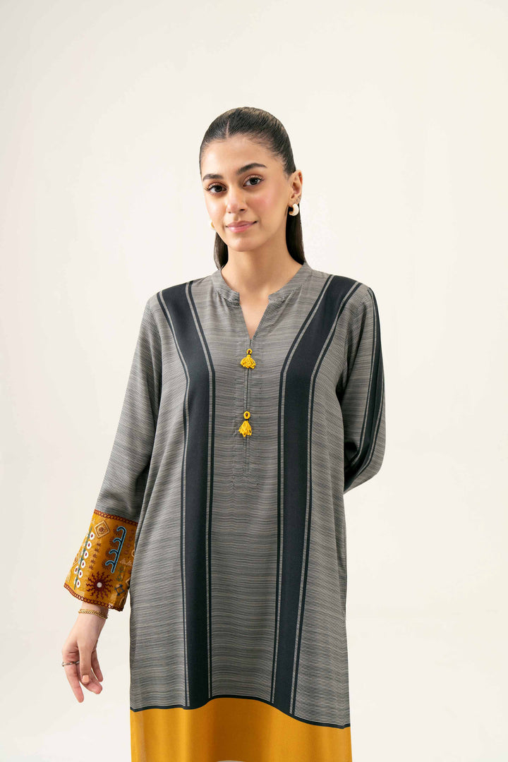 Band Neckline With Slit & Tassels Detail, Embroidered Sleeves Edges