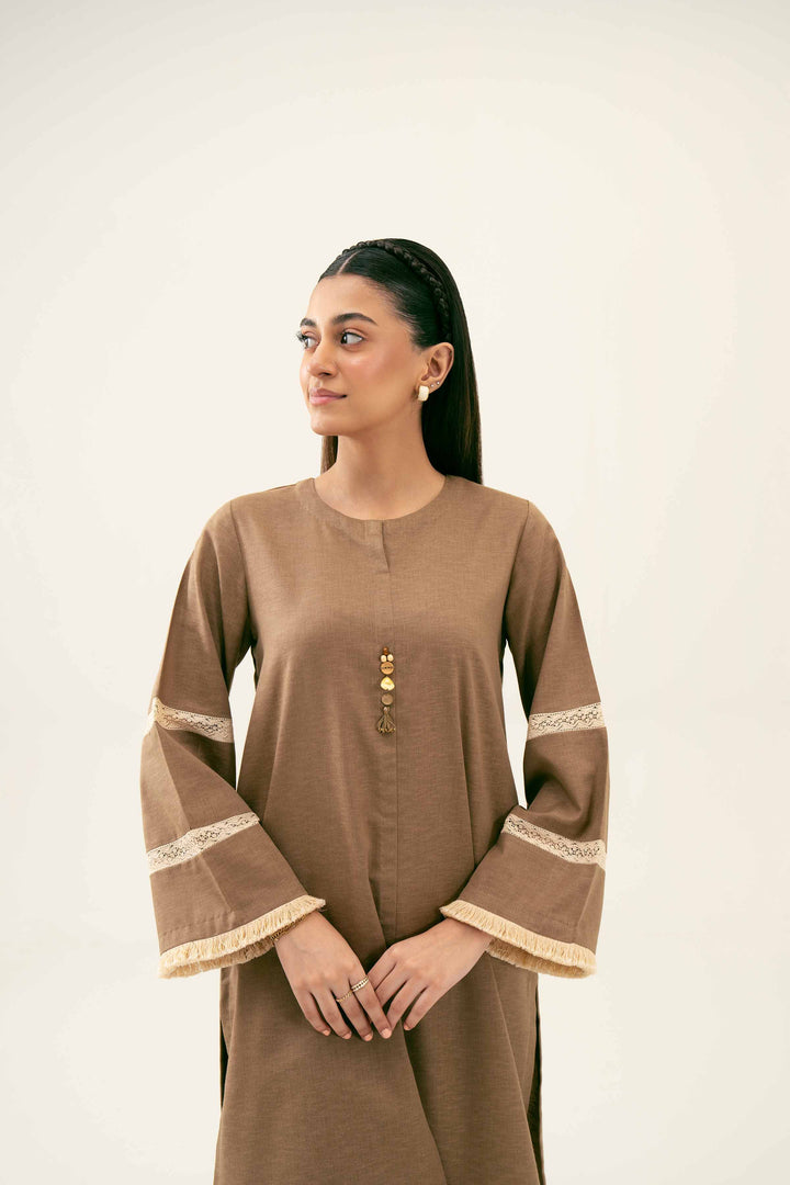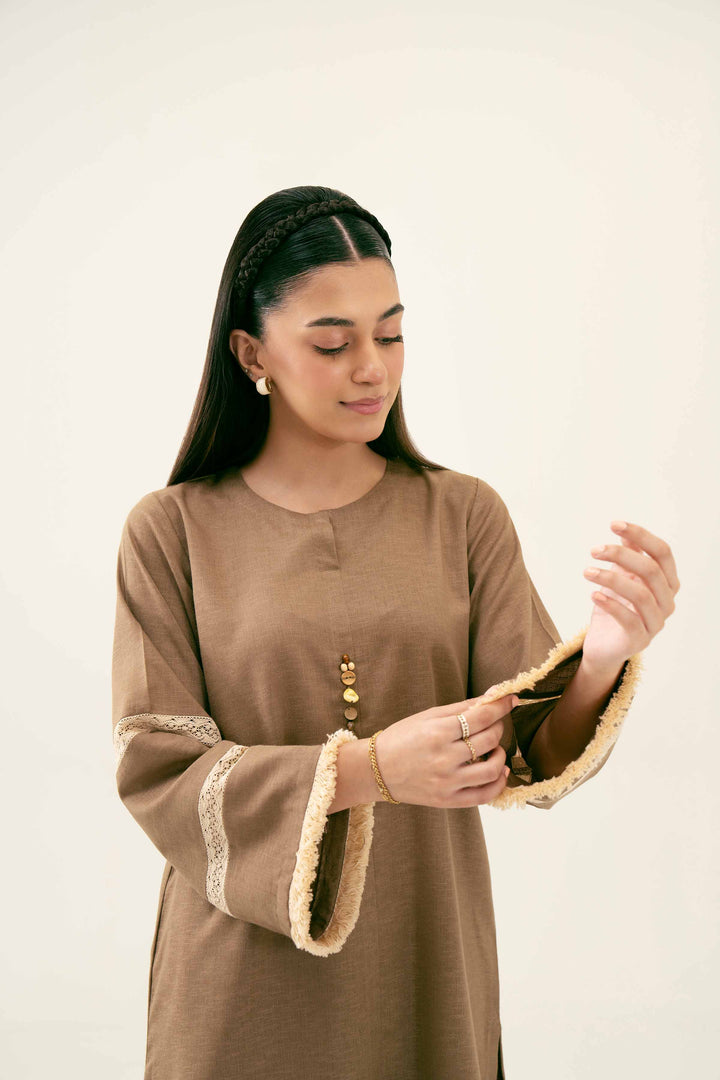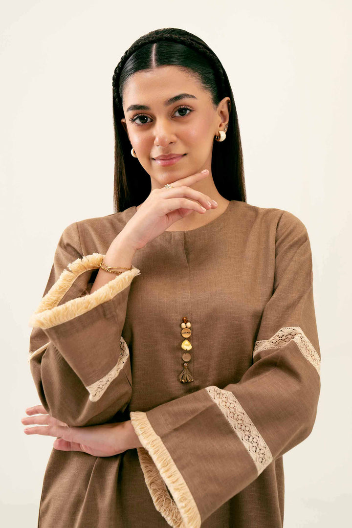 Round Neckline With Accessory Detail On Placket, Regular Sleeves With Lace Detail, Button Down Shirt