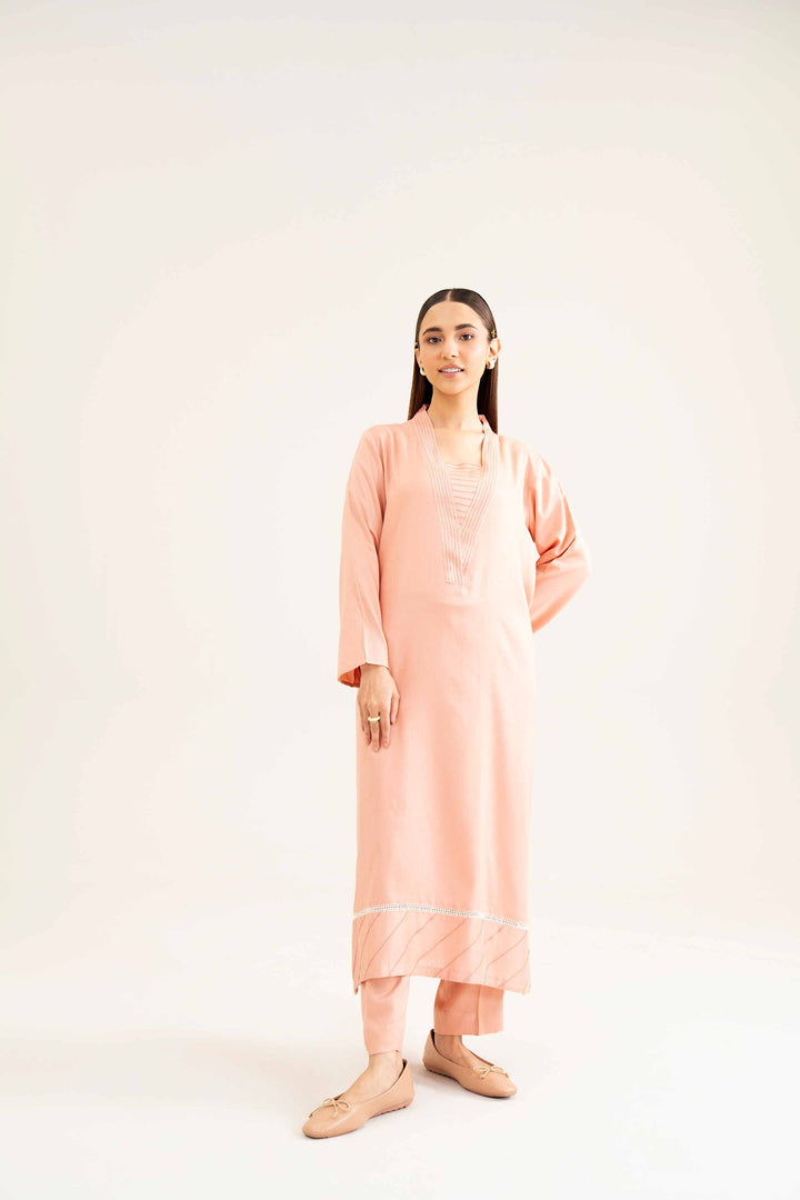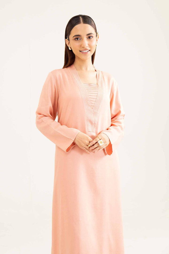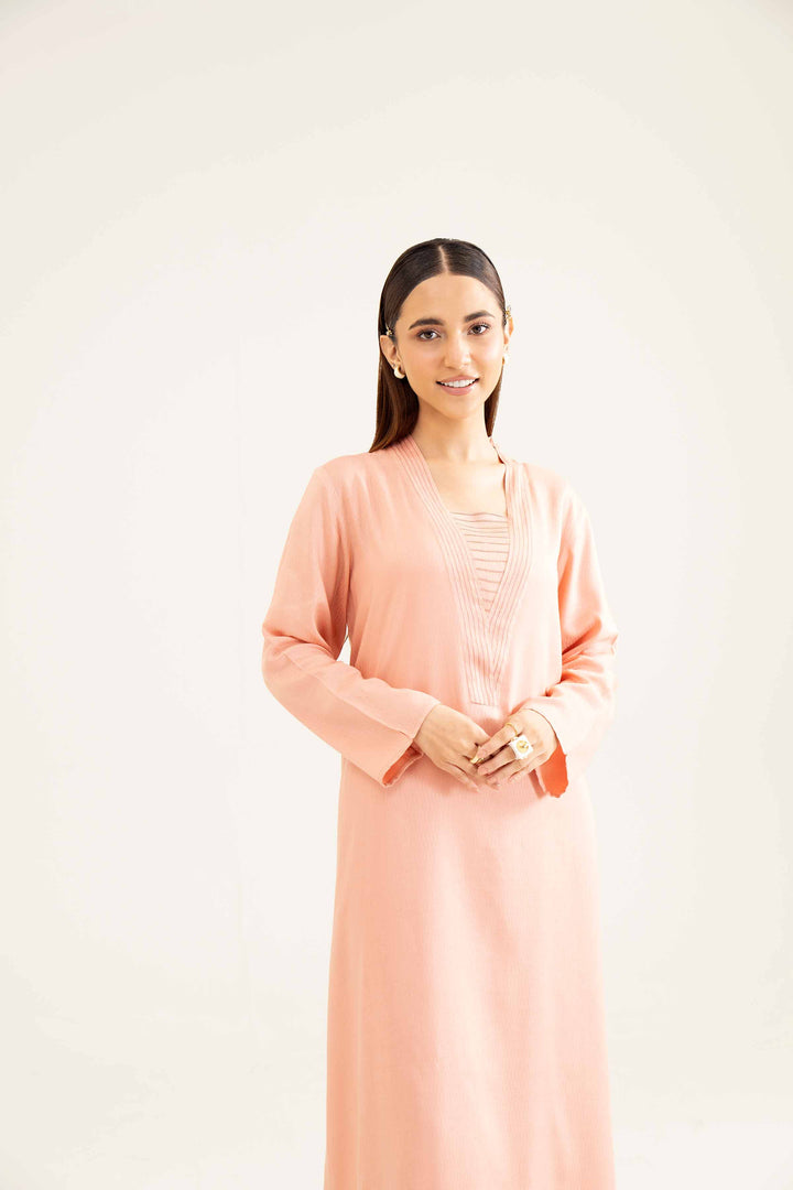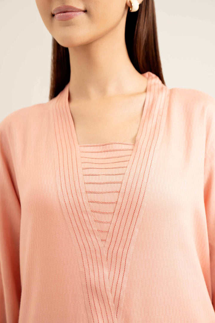 Topstitched V Neckline, Pintuck & Lace Detail On Hem, Long Shirt