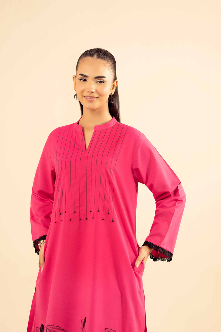 Shirt With a Band And Slit, Pin Tucks On Front. Embroidered Border On Hem With Bead Work Details On It.